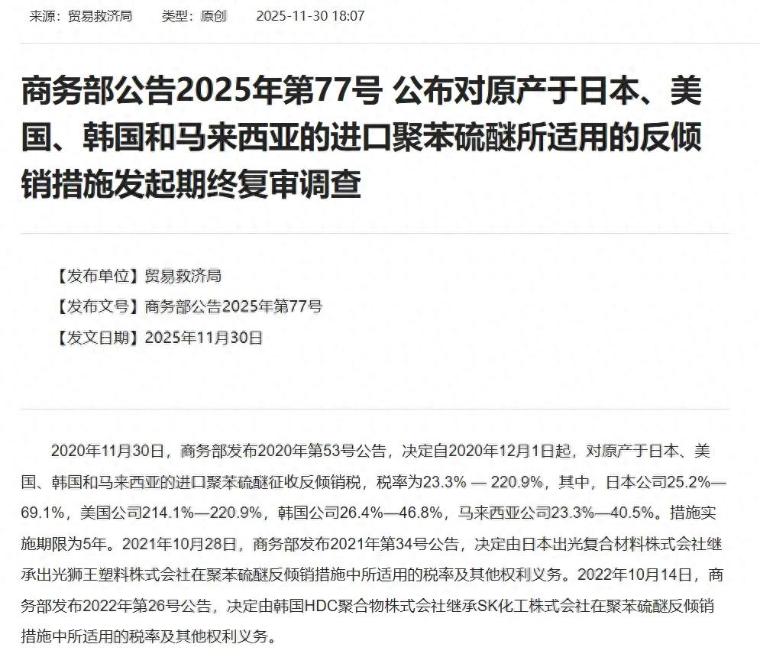 商务部宣布自2025年12月1日起,对原产于日本、美国、韩国和马来西亚的进口聚苯硫醚(PPS)所适用的反倾销措施进行期终复审调查。在为期一年的复审期间,将继续实施反倾销措施。
