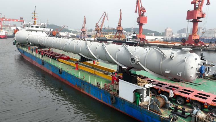 近日,由大连金重机器集团有限公司承制的中海壳牌惠州三期乙烯项目年产40万吨线性α-烯烃(LAO)装置2台核心超限设备高纯C4产品塔、高纯C6产品塔在大连港码头启运交付。