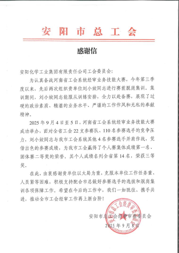 近日,安化集团工会收到安阳市总工会发来的感谢信。信中特别提及,安化职工刘小姣在河南省工会系统经审业务技能大赛中表现突出、斩获佳绩,为全市工会工作赢得了荣誉。
