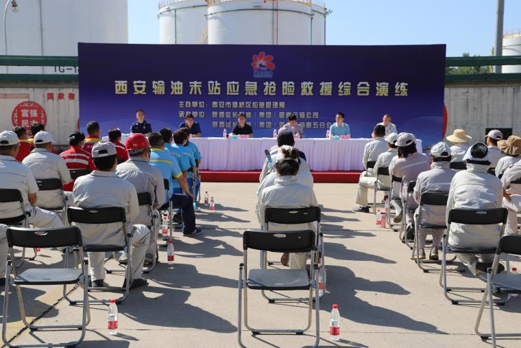 “报告鹤位巡检,汽油8号装车台正在装车的装车泵法兰处发生泄漏,请求支援!”6月24日9时20分,随着一声急促的警报声响起,西安市灞桥区2022应急抢险救援综合演练在延长石油管道运输第五分公司西安输油末站拉开帷幕。