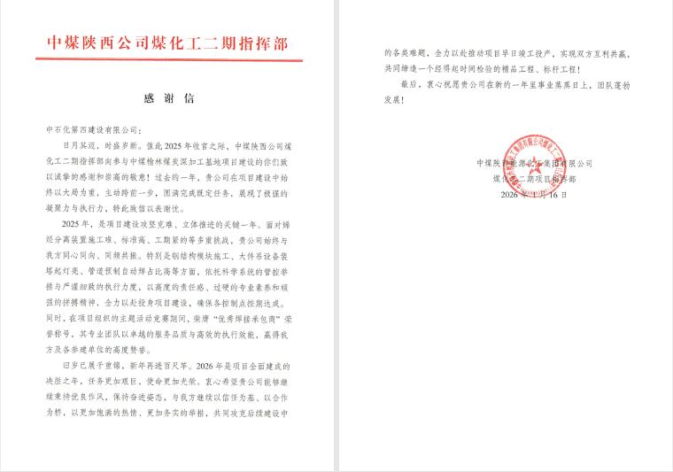 1月27日,从中石化四建公司获悉,近日,中煤陕西公司煤化工二期指挥部向参与中煤榆林煤炭深加工基地项目建设的石化四建公司发来感谢信。