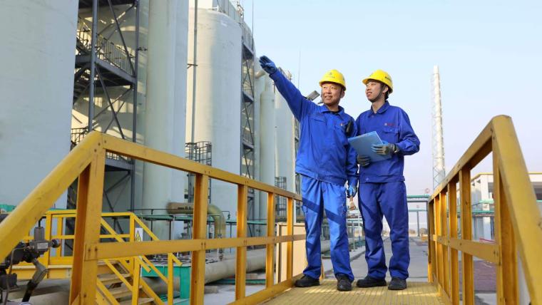 汉沽盐场卤水综合利用一厂职工巡查装置安全。(汉沽盐场供图)