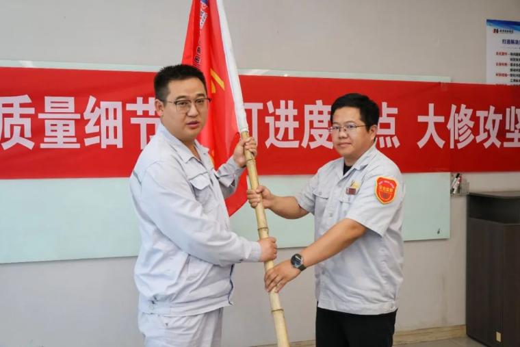 随后,集团生产副总裁付卫兵向谢进军授“同心战大修”战旗。谢进军要求全体参检人员必须保持高度警惕,始终绷紧安全与效率之弦,丝毫不可松懈。要严守安全红线,重点针对交叉作业、设备拆装、化工介质处理等关键环节,强化严格监管、从严追责,坚决杜绝安全隐患;要狠抓质量环节,大力发扬“工匠精神”,严格遵循规程精细作业,每个步骤认真对待、绝不敷衍;要紧盯进度节点,对照时间节点,将任务细化分解,责任落实到人;要以“大修攻坚有我”的使命感,在检修中勇挑重担,在实战中增长才干,扛责冲锋、上下一心、精益求精,保质保量完成检修任务,为全年生产稳定运行筑牢根基。