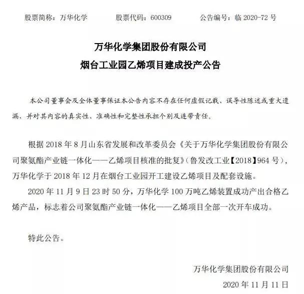 11月11日,万华化学发布公告称,11月9日23时50分,万华化学100万吨乙烯装置成功产出合格乙烯产品,标志着公司聚氨酯产业链一体化——乙烯项目全部一次开车成功。