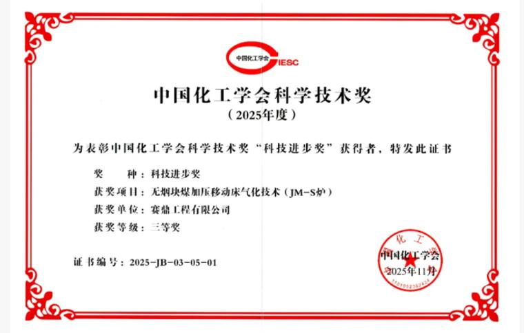 日前,无烟块煤加压移动床气化技术(JM-S炉)获中国化工学会科技进步三等奖。