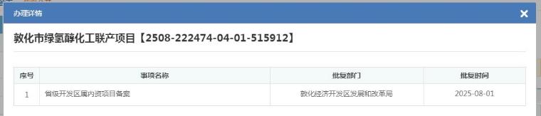 8月1日,吉林省敦化市绿氢醇化工联产项目获备案。