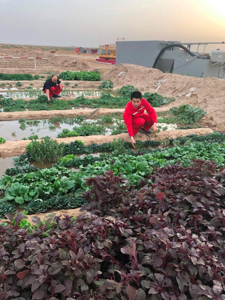 这片生机盎然的绿色,让奋战在沙漠中的“石油红”心情愉悦,充满了希望。工作之余,大家不约而同地到菜园里转转,翻翻土,拔拔草,浇浇水,不仅锻炼了身体,增强了体质,也为单一枯燥的境外生活增添了乐趣。而这片绿,也让该队实现了食堂蔬菜供应的自给自足,减少了生活污水的排放,降低了井队生活污水回收费用的支出。
